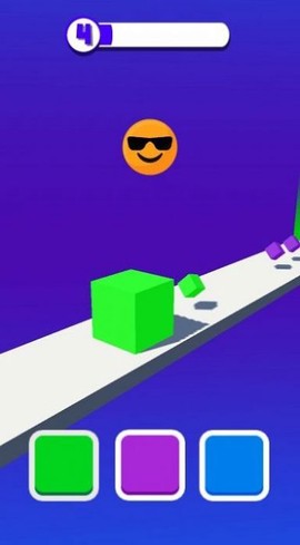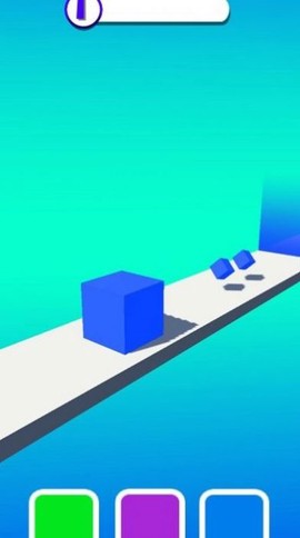 3. 玩家操控多色方块持续前进,道路前方分布大量小方块,需通过颜色匹配实现连续突破。